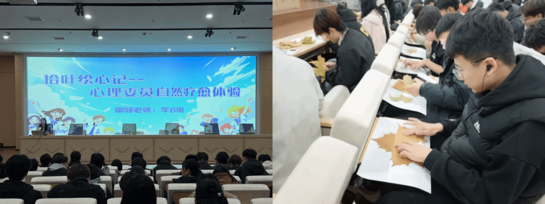 德育培训结束后,李云琪老师主导的美育维度“拾叶绘心记——心理委员自然疗愈体验”活动接续开展。活动创新性地融合劳动体验与艺术表达,组织学员在校园中亲近自然、捡拾落叶,再以树叶为素材进行绘画创作。学员们在60分钟的时间里尽情发挥创意,通过树叶的形态、纹理与色彩,投射内心情感。此次活动不仅帮助心理委员舒缓了日常工作压力,提升了审美感知与情绪表达能力,更让大家掌握了“自然+艺术”这一简单易行的心理调节方法,为后续在班级开展相关活动积累了实践经验。