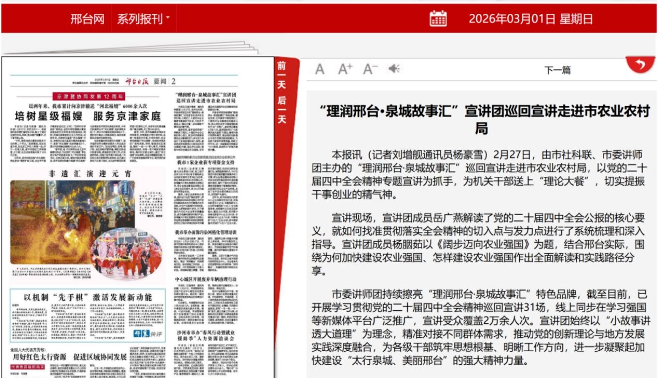 我校宣讲团成员、马院教师杨胭茹以《阔步迈向农业强国》为题,结合邢台实际,围绕为何加快建设农业强国、怎样建设农业强国作出全面解读和实践路径分享,《邢台日报》撰文报道。
