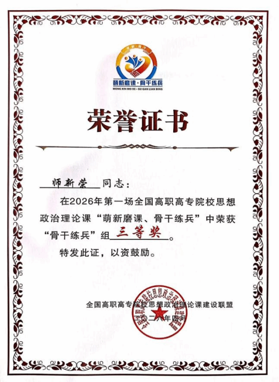 4月11日,2026年第一场全国高职高专院校思政课“萌新磨课、骨干练兵”教学展示活动圆满落幕。我校马克思主义学院教师师新荣凭借扎实的理论功底与精妙的教学设计,在“思想道德与法治”赛项中脱颖而出,荣获“骨干练兵”组三等奖,这是我校首次在该项赛事的国赛舞台上斩获奖项。